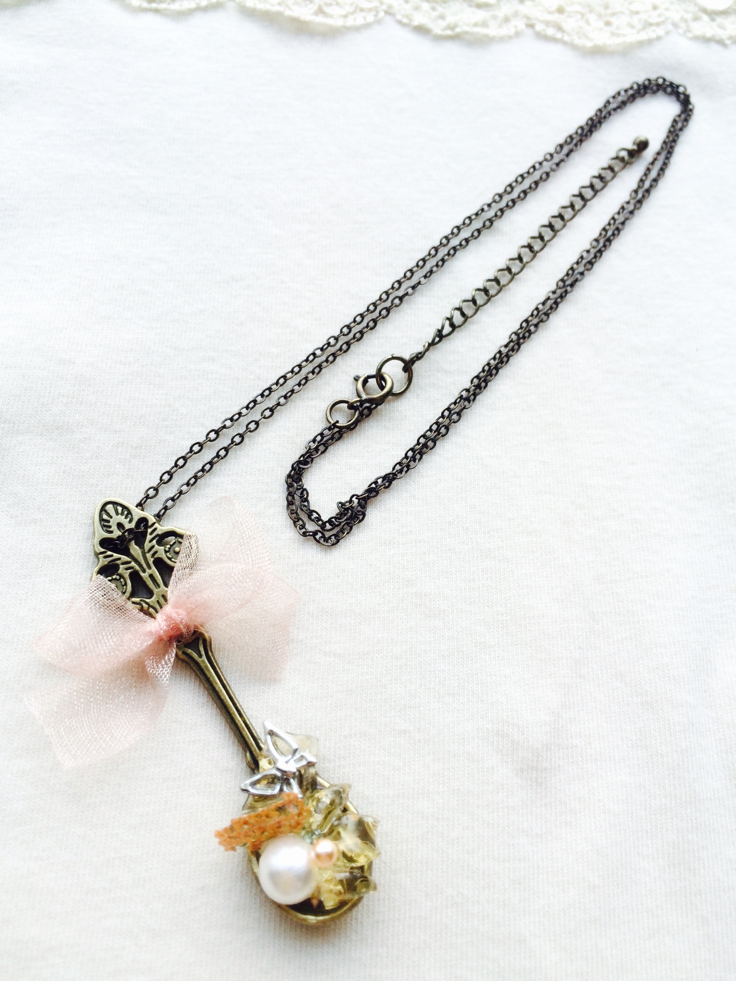 アンティークスプーンの上にガラスカレットやら花やらパールやらを乗せたネックレス*