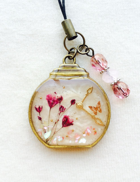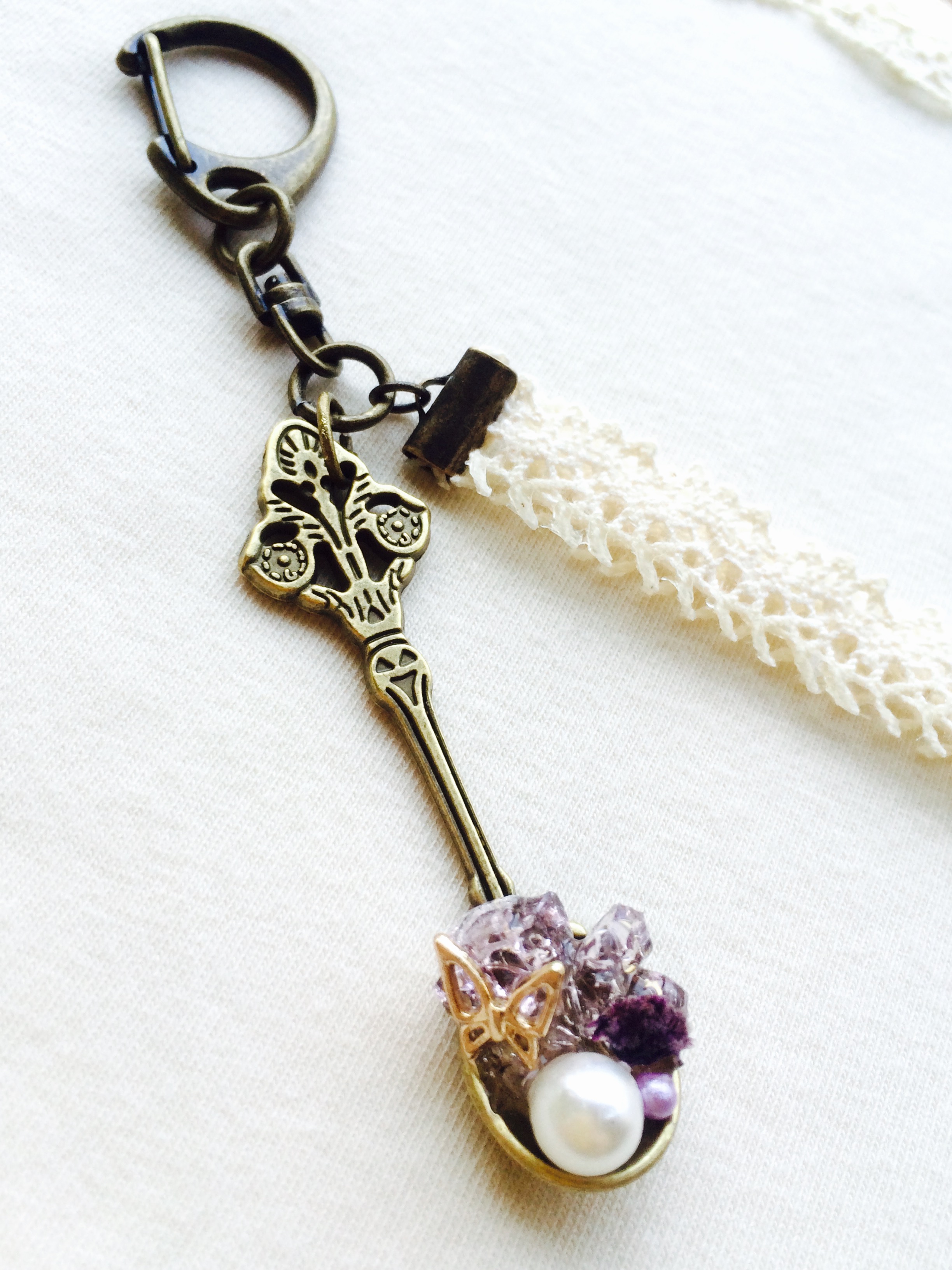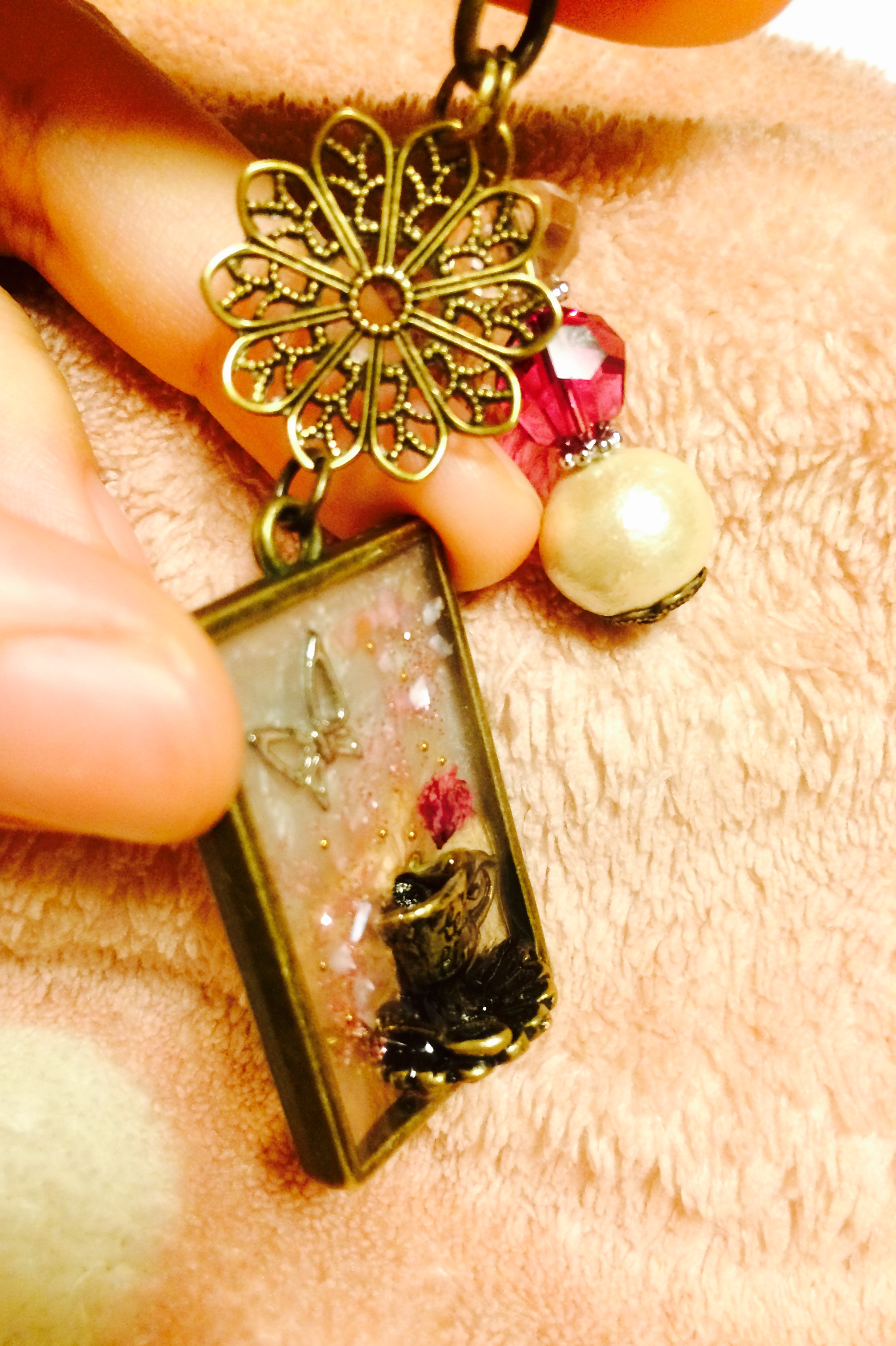 アンティークスプーンの上にガラスカレットやら花やらパールやらを乗せたネックレス*